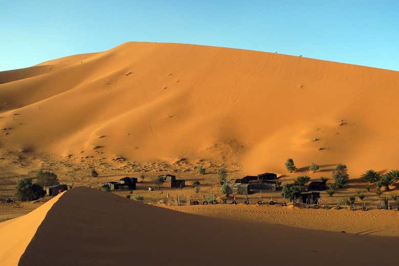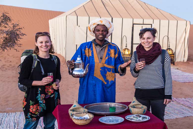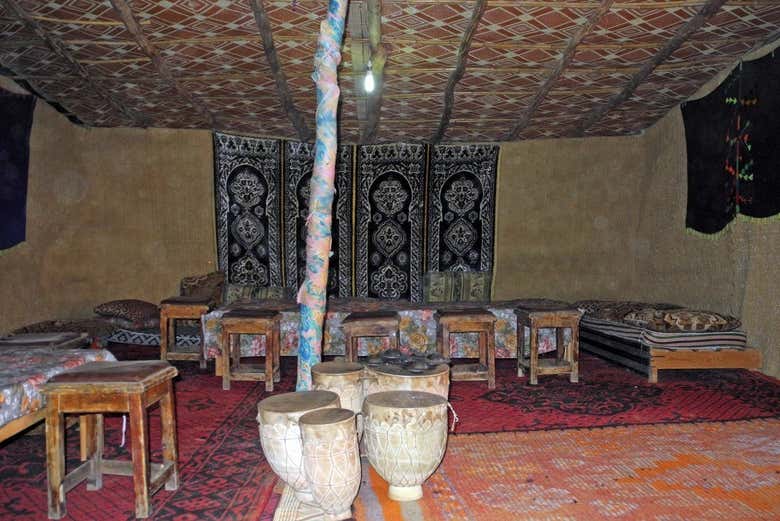 From Khamlia, we'll drive to Erg Chebbi, the highest dunes in Morocco. Upon arrival, hop on a camel, which will take you to the camp situated in the middle of the large sea of dunes. It'll take approximately one and a half hours. You'll sleep in an authentic Amazigh camp.